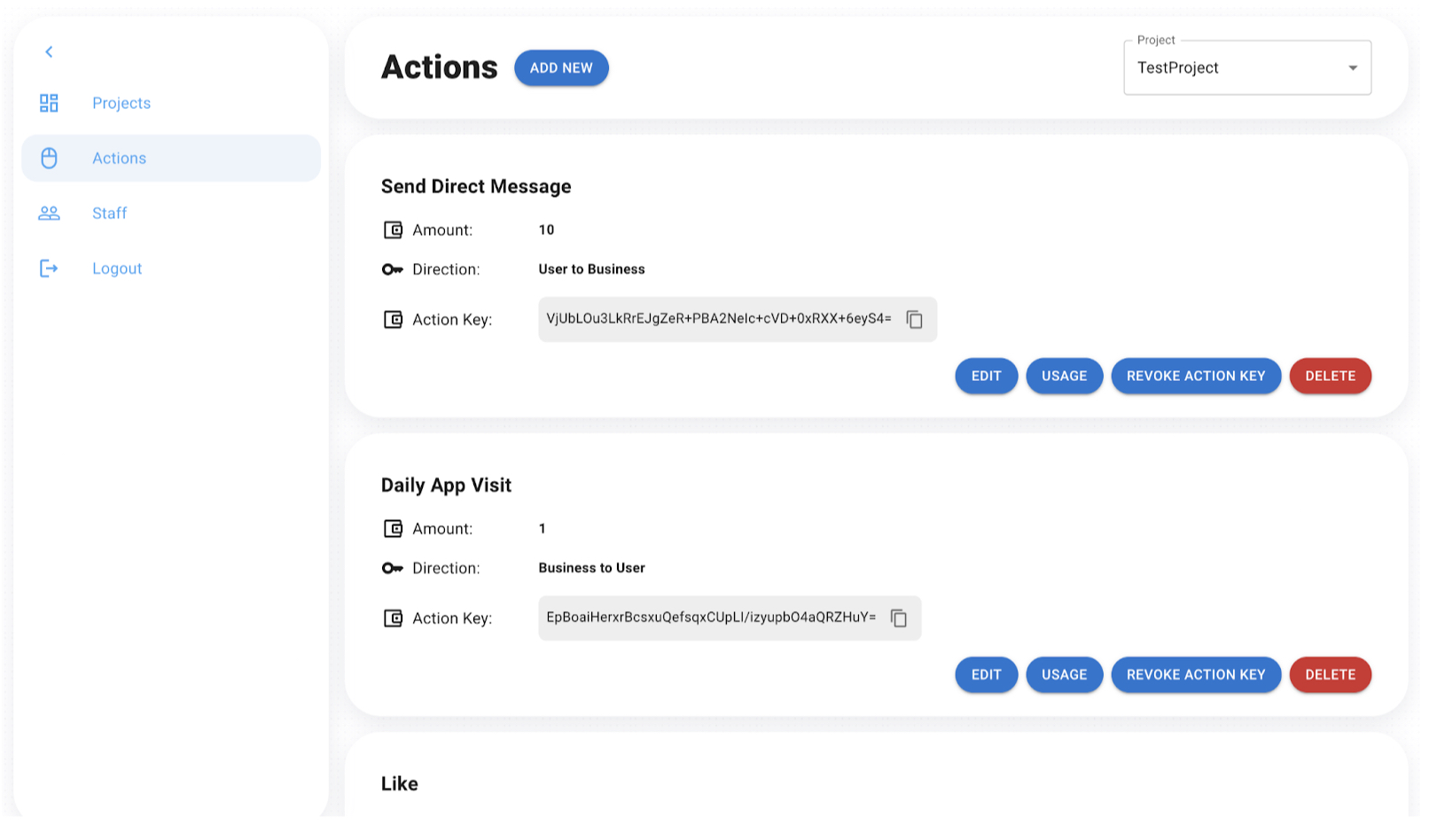 To use Abeld services you need to specify the gamification activities within your app. To add actions, go to this link or simply click on the Actions tab inside the business panel. Make sure you have selected the project you want to add actions to on the top right side of the screen.