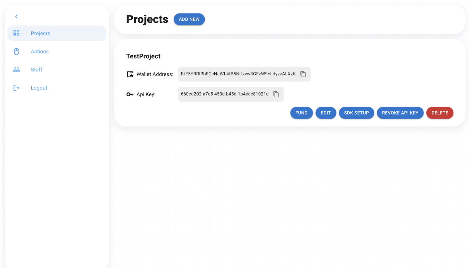 Here, you can edit your project info, add actions, and staff which will be explained in the next sections.